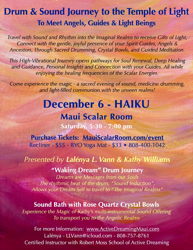 Lalénya L. Vann is a certified teacher with the Robert Moss School of Active Dreaming. She lives on Maui, and is an artist, painting images from her dreams. See Lalénya’s art and paintings at llvann.com.